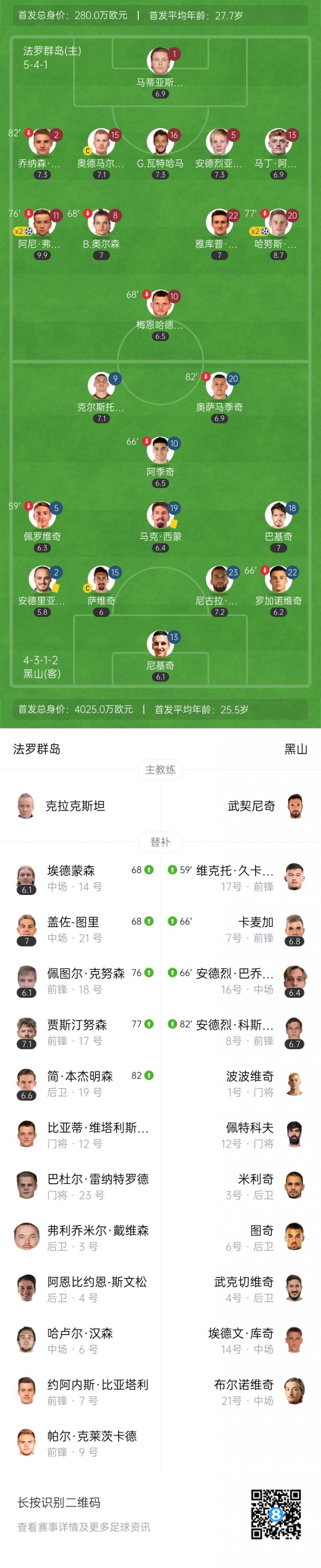 对比两队的阵容,法罗群岛的首发11人身价仅280万,大部分球员都在本土联赛效力;而黑山锋线坐拥两位在意甲效力的球员,亚特兰大的克尔斯托维奇和尤文的阿季奇,首发11人身价4025万欧。