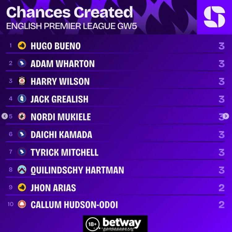 9月24日讯 英超第5轮战罢,squawkafootball列各项数据排行,在创造机会方面,狼队后卫乌戈-布埃诺等8名球员各创造3次机会。英超第5轮创造机会榜:1、乌戈-布埃诺(狼队):3次亚当-沃顿(水晶宫):3次哈里-威尔逊(富勒姆):3次格拉利什(埃弗顿):3次穆基勒(桑德兰):3次镰田大地(水晶宫):3次蒂里克-米切尔(水晶宫):3次哈特曼(伯恩利):3次9、阿里亚斯(狼队):2次奥多伊(诺丁汉森林):2次