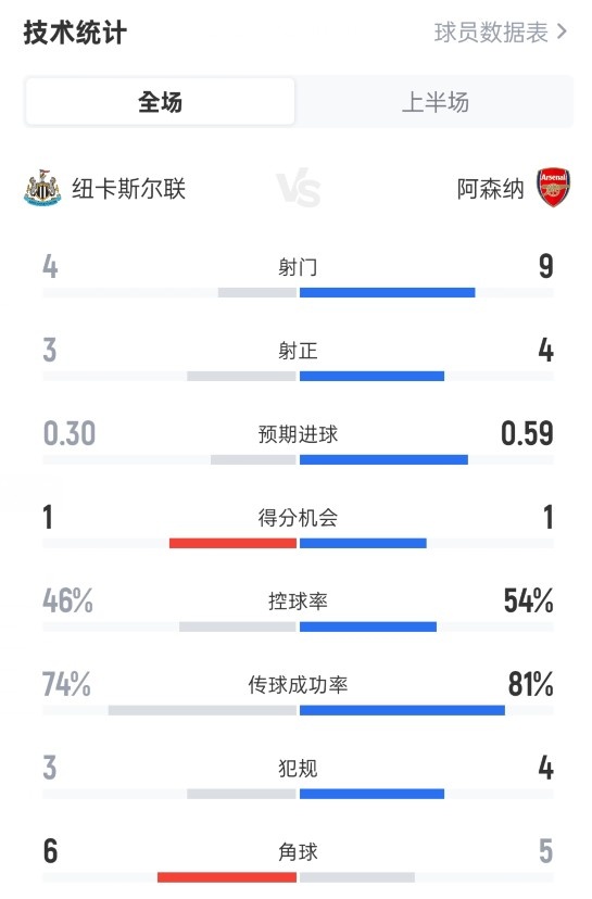 纽卡半场1-0阿森纳数据:射门4-9,射正3-4,控球率46%-54%
